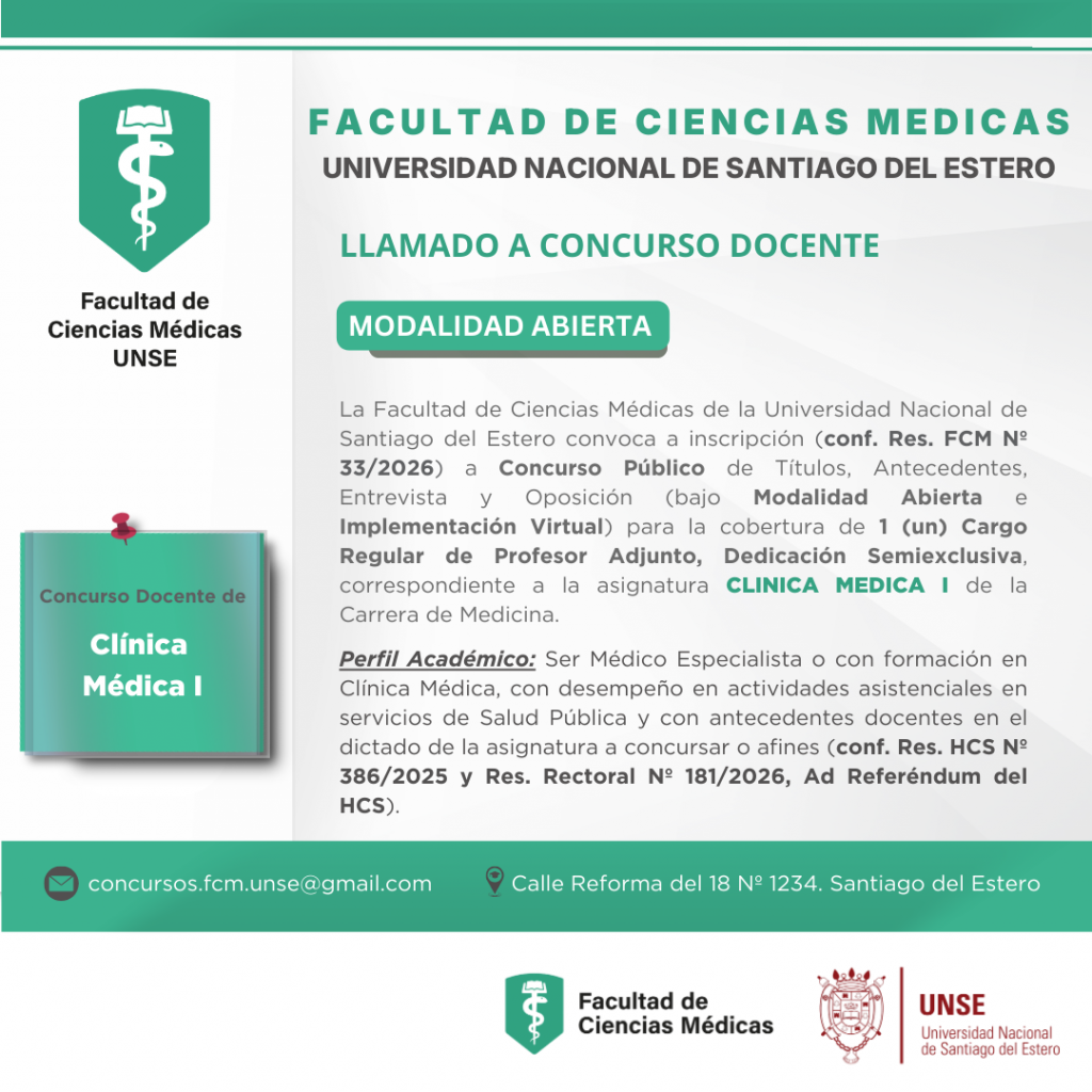 La Facultad de Ciencias Médicas de la Universidad Nacional de Santiago del Estero, convoca a inscripción al Concurso Público de Títulos, Antecedentes, Entrevista y Oposición para la cobertura de 1 (un) Cargo Docente de Carácter Regular en la asignatura Clínica Médica I perteneciente al 4to año de la Carrera de Medicina (conf. Res. FCM Nº 33/2026).