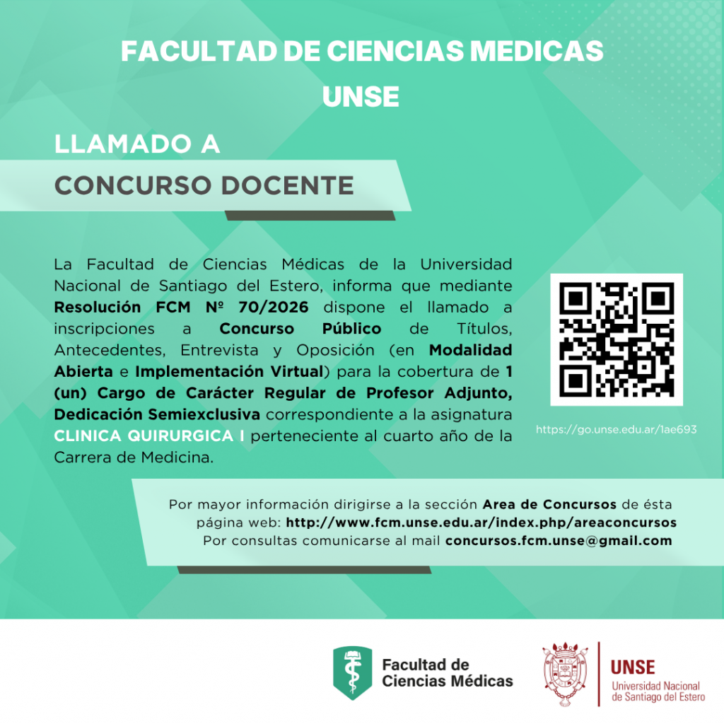 La Facultad de Ciencias Médicas de la Universidad Nacional de Santiago del Estero, convoca a inscripción al Concurso Público de Títulos, Antecedentes, Entrevista y Oposición para la cobertura de 1 (un) Cargo Docente de Carácter Regular en la asignatura Clínica Quirúrgica I perteneciente al 4to año de la Carrera de Medicina.